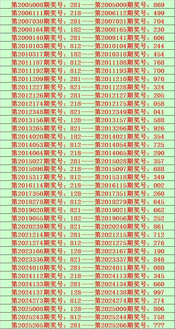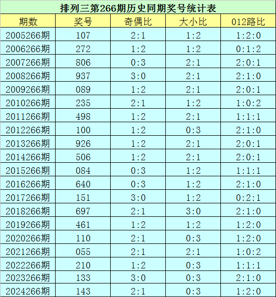 排列三第2025266期开奖日期:2025年10月7日,历史上第266期已开出了20次奖号,历年同期号码分别为:107、272、806、937、089、235、498、100、926、506、084、640、151、697、461、110、055、210、133、143。