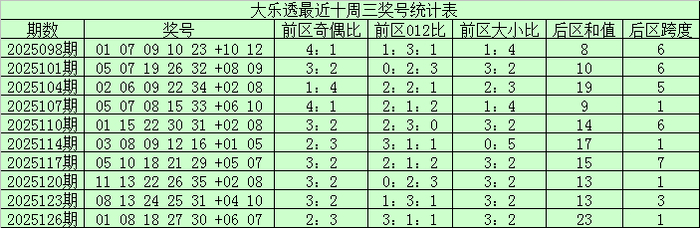 前区奇偶走势:上期前区奇偶比为2:3,上周三前区奇偶比2:3,最近十周三奇数号码表现占优,本期看好奇数号码继续走热,推荐奇偶比4:1。