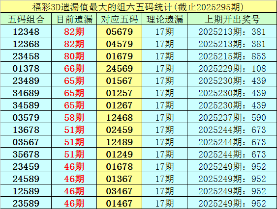 福彩3D五码遗漏组六分析(第2002001期-第2025295期)