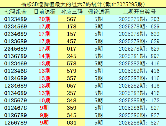 1.截止第25295期,七码组六遗漏最大的是:0123489,当前遗漏20期。