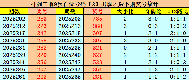 百位号码:百位上期奖号为2路、奇数、小 号:2,历史上百位号码2共开出738期,前一次开出期数在第2025264期,上期开出重复号码。