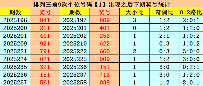 个位号码:上期奖号为小 号、奇数、1路号码:1,历史上个位号码1共开出734期,前一次出现在第2025257期,上期遗漏7期再出。