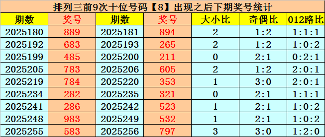 十位号码:十位上期开出奇数、小 号、2路号码:8,历史上十位号码8共开出757期,上一次出现在第2025255期,上期奖号遗漏值为9期。