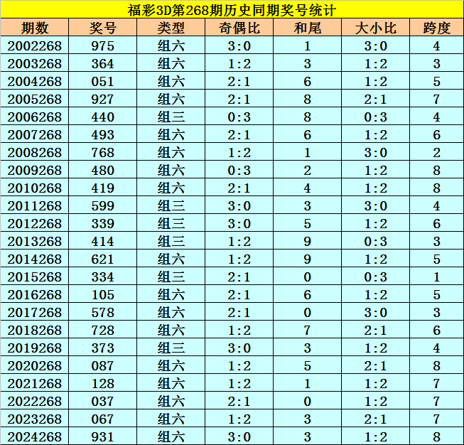 福彩3D历年第268期同期奖号为:975 364 051 927 440 493 768 480 419 599 339 414 621 334 105 578 728 373 087 128 037 067 931。