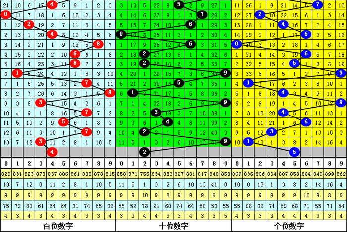 跨度分析:在第268期同期历史奖号中,号码跨度大小比为14:9,012路比为6:9:8,奇偶比为11:12,跨度开出频次分别为:跨度4、7、8出现4次,跨度3、5、6出现3次,跨度1、2出现1次,跨度0、9出现0次,本期关注小跨度出现,一码跨度参考3。